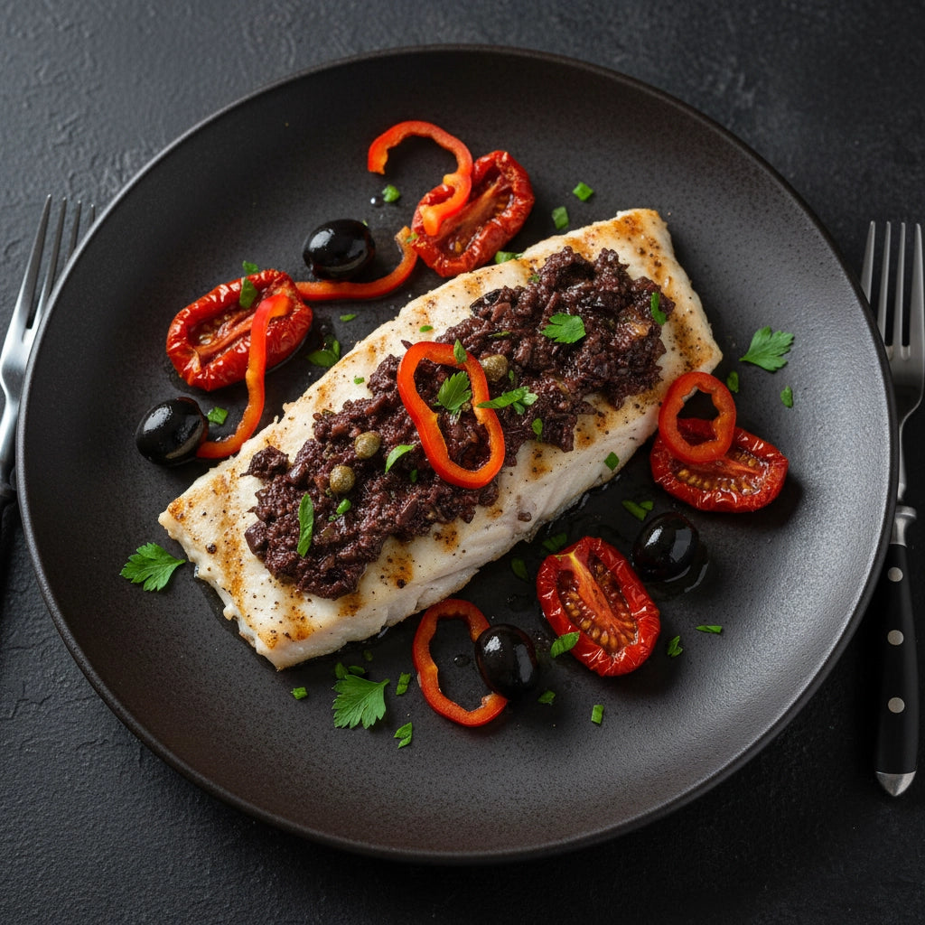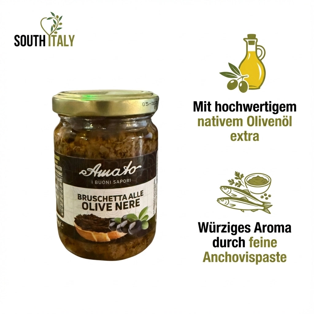 Unsere Schwarze Olivensauce wird aus sorgfältig ausgewählten schwarzen Oliven hergestellt und mit feinen Kapern, getrockneten Tomaten und einem Hauch Knoblauch veredelt. Natives Olivenöl extra und Sonnenblumenöl sorgen für eine cremige, streichzarte Konsistenz, während Anchovispaste der Sauce eine subtile, mediterrane Würze verleiht.