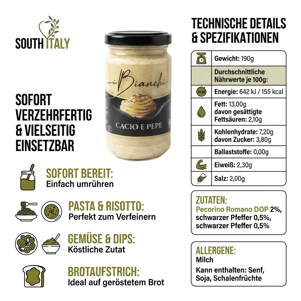 Diese cremige Käsezubereitung kombiniert den kräftigen, charakteristischen Geschmack des Pecorino Romano DOP mit der würzigen Note von schwarzem Pfeffer. Hergestellt aus hochwertiger Vollmilch und Schafskäse, bietet die Mischung eine harmonische Balance aus würzigem Käsearoma und sanfter Cremigkeit.