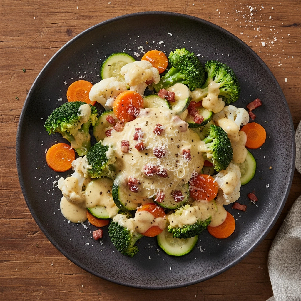 Zutaten: Pulvermischung rekonstruiert 61,5% (Käse 25% [MILCH, Lab, Salz], Molkenpulver, pasteurisiertes Eigelb 9%), Wasser, Sonnenblumenöl, Pecorino Romano DOP 3% (Schafsmilch, Salz, Lamm-Lab), Zwiebeln, modifizierte Maisstärke, geräucherte Pancetta 2% (Schweinefleisch, Salz, natürliche Aromen, Natriumascorbat, Natriumnitrit), Salz, natürliche Aromen, Zucker, Hefeextrakt, Knoblauchpulver, schwarzer Pfeffer 0,2%, Gewürzmischung, Schmelzsalz, Milchsäure, Kaliumsorbat..