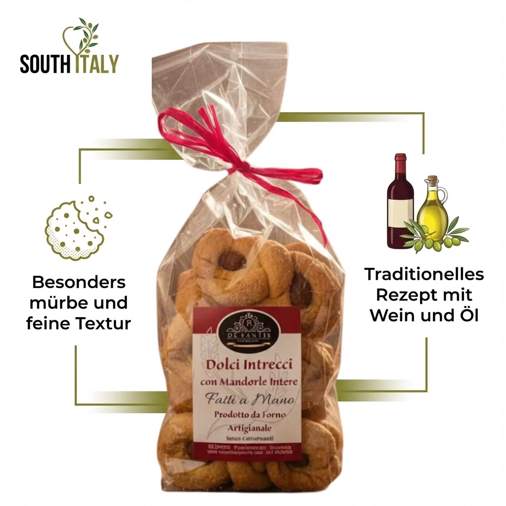 Dolci Intrecci sind typische, sehr krümelige apulische Süßigkeiten mit einer charakteristischen Zopfform, die nach der Zubereitung einer einfachen Mischung aus Mehl, Zucker, Wein und Öl mit gerösteten Mandeln und Kristallzucker dekoriert werden.