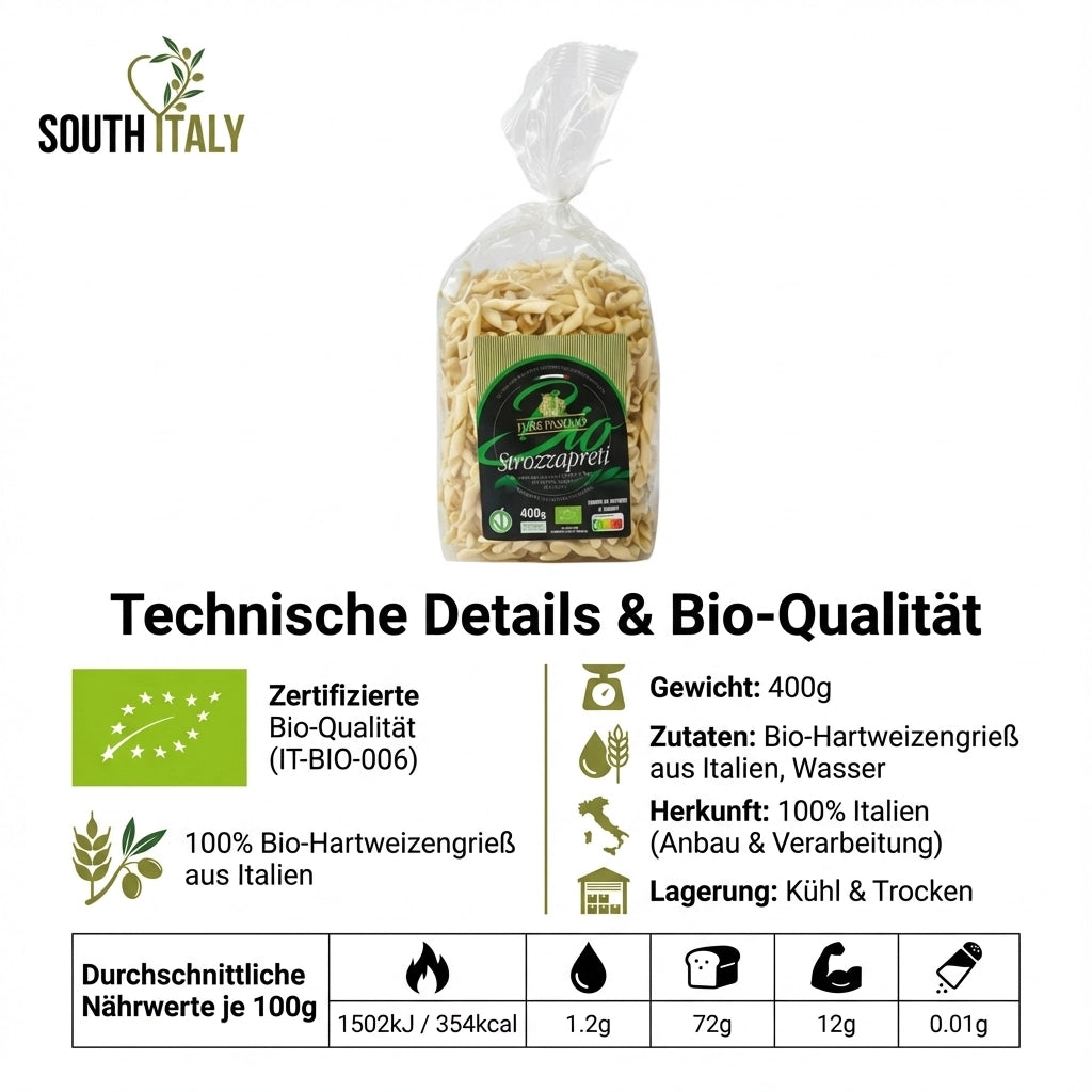 Diese Bio-Hartweizengrießpasta aus Italien wird aus hochwertigem, italienischem Bio-Hartweizen hergestellt und überzeugt durch ihre authentische Qualität und ihren natürlichen Geschmack. Der Hartweizen stammt ausschließlich aus kontrolliert biologischem Anbau in Italien und wird dort auch vermahlen – für maximale Transparenz und Herkunftssicherheit.