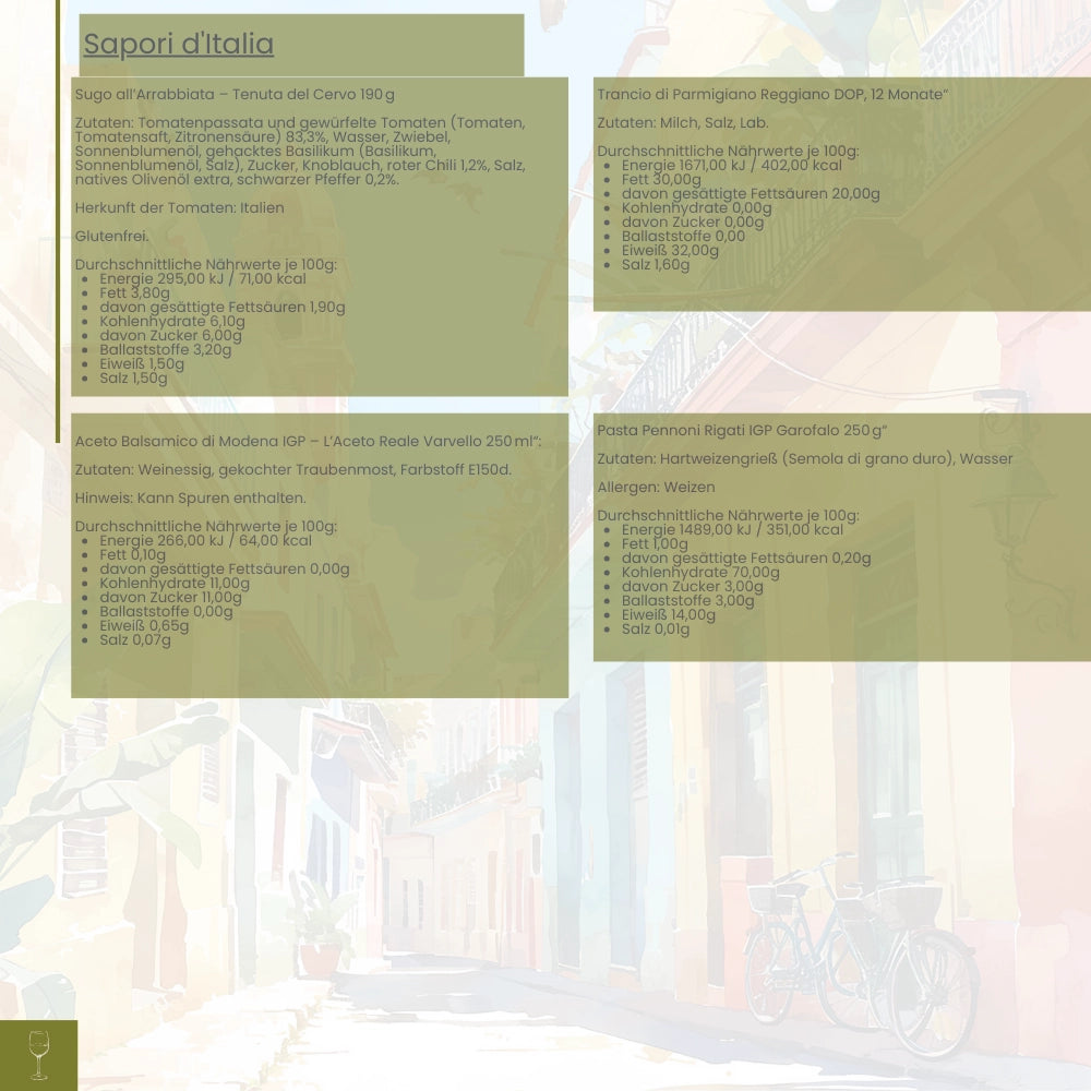 Dieses Set kombiniert ikonische Produkte aus den bekanntesten Regionen Italiens – perfekt für Gourmets, Genießer oder als hochwertiges Geschenk zu Festen, Geburtstagen und besonderen Anlässen.