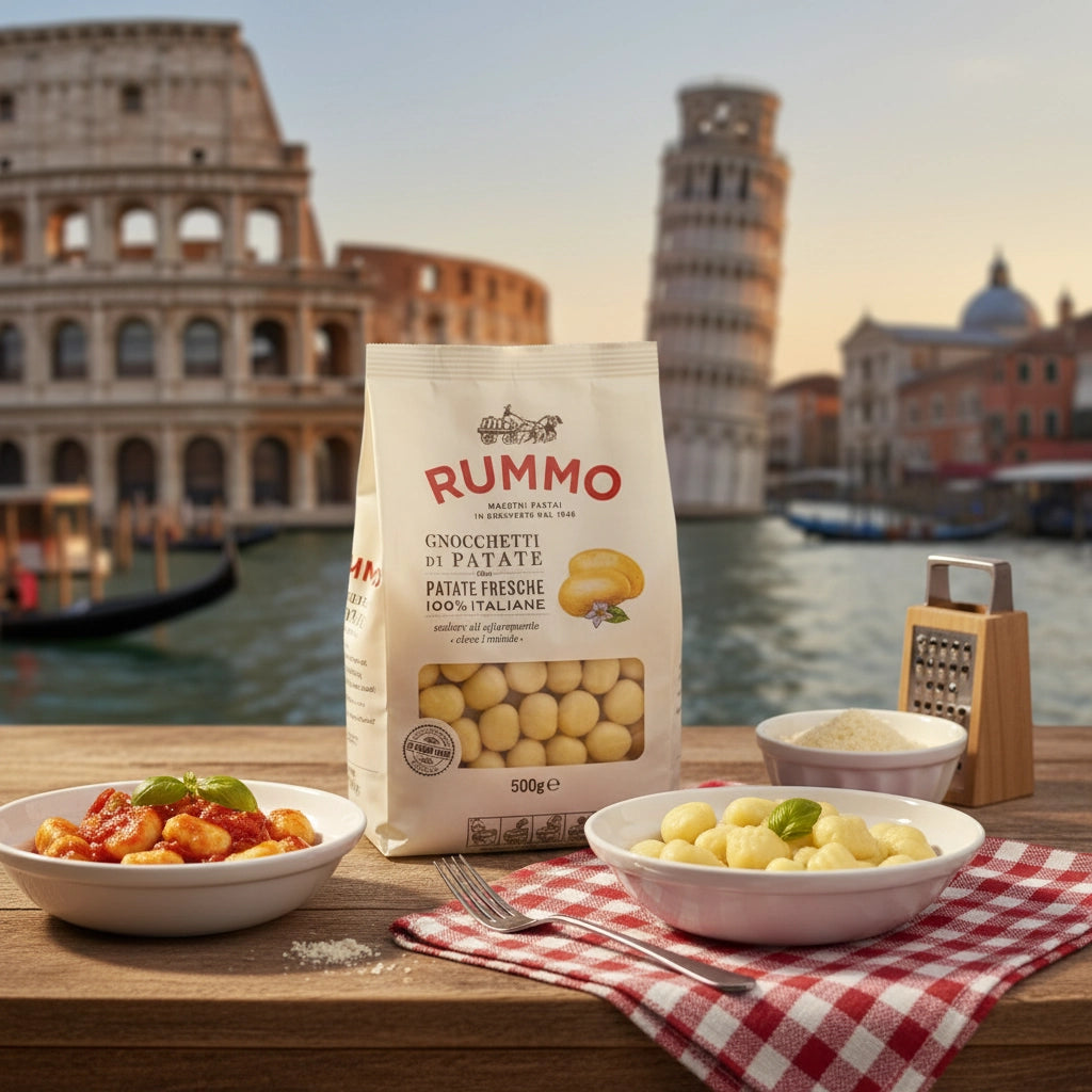 Die traditionellen RUMMO Gnocchetti di Patate werden mit ausgewählten, frischen italienischen Kartoffeln sowie hochwertigem Hartweizengrieß hergestellt. Ihre leichte, zarte Textur und die Fähigkeit, Saucen perfekt aufzunehmen, machen sie zu einem idealen Gericht für die schnelle, authentische italienische Küche.